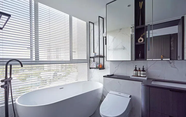 Together with the suspended cabinet below the wash basin, wall-mounted storage shelves with mirrored doors above, and the refreshing monochromatic colour scheme, the master bathroom exudes a bright and breezy feel.