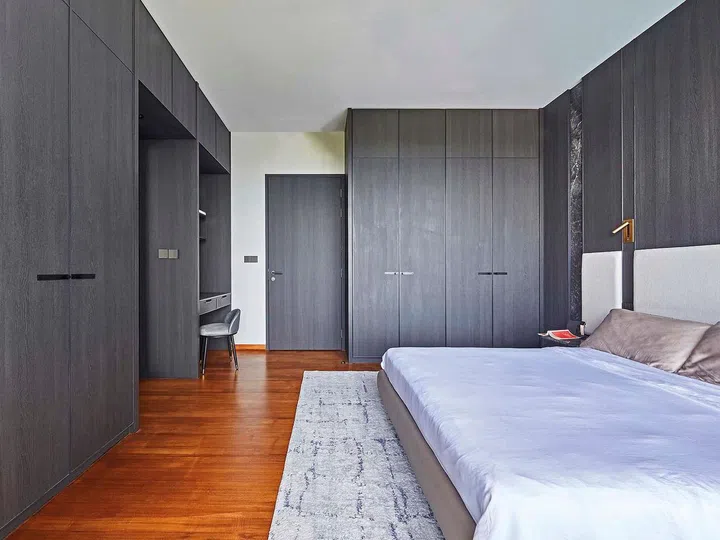 Surprisingly, the dark colour palette is not overpowering or sombre. The couple admitted that it was not something they thought they would have liked, but they ended up loving the restful and cosy ambience.