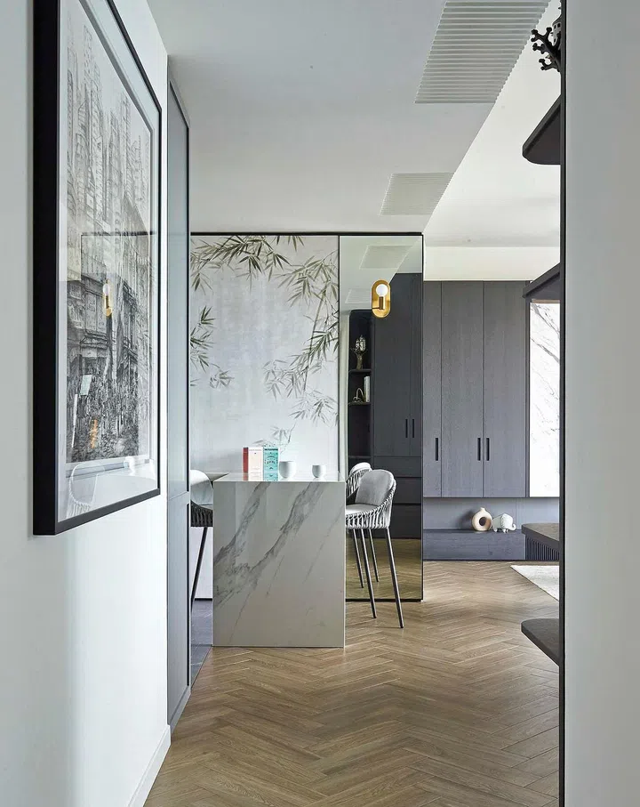 Having outgrown their previous Scandinavian interior design style apartment of seven years, this couple, both legal professionals in their 30s, decided on a more refined, modern luxe design for their new home.