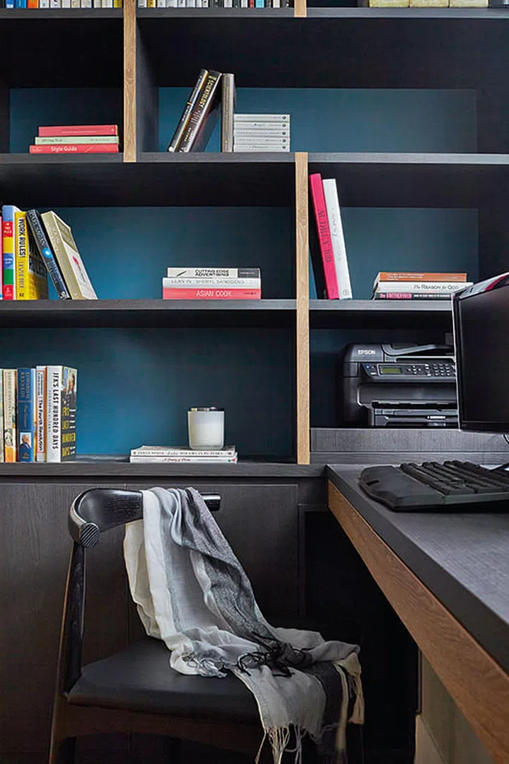 The bookshelves in the study area were inspired by Piet Mondrain's colourful works on composition and grids. "I has the backing painted a deep nlue to make the shelves 'pop', says Joey.