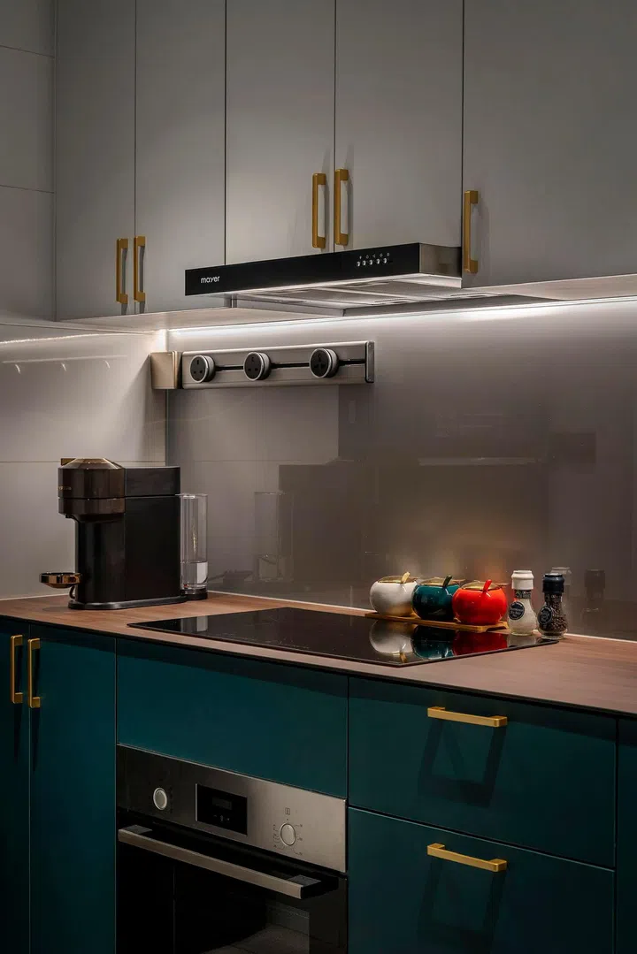 The colours in the living room extend into the kitchen area, with the navy blue creating an interesting contrast to the silver backsplash.