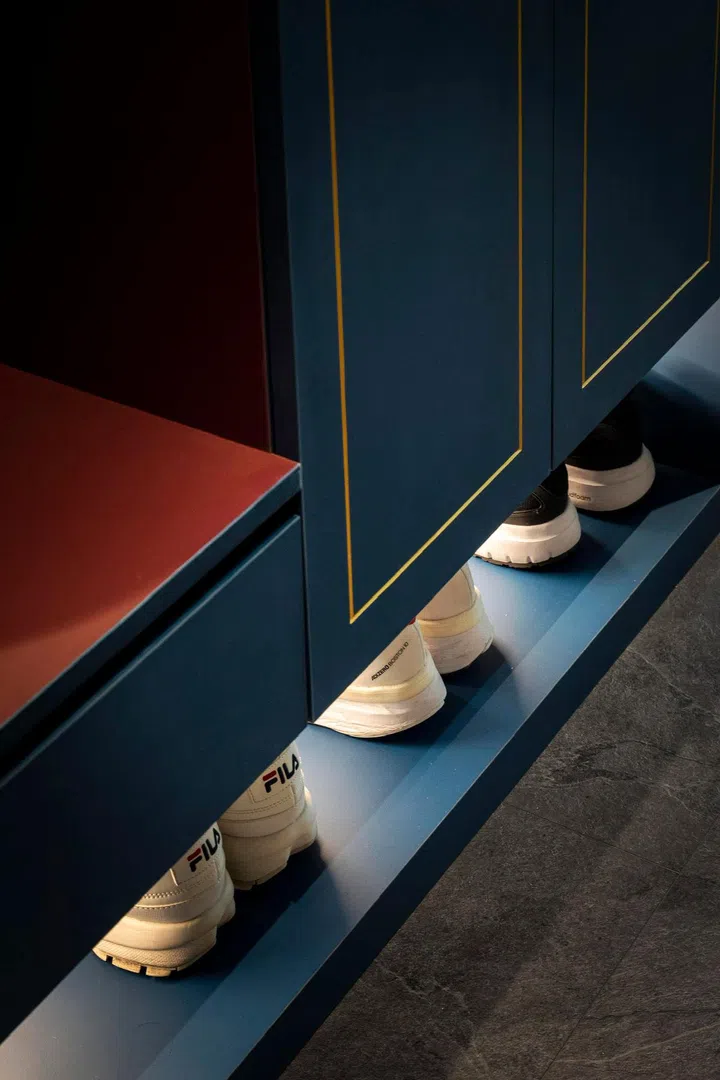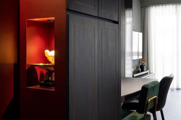 "To bring out some personality, there was some play of colour contrast, such as navy with maroon on the entrance carpentry works for shoe cabinet and settee.