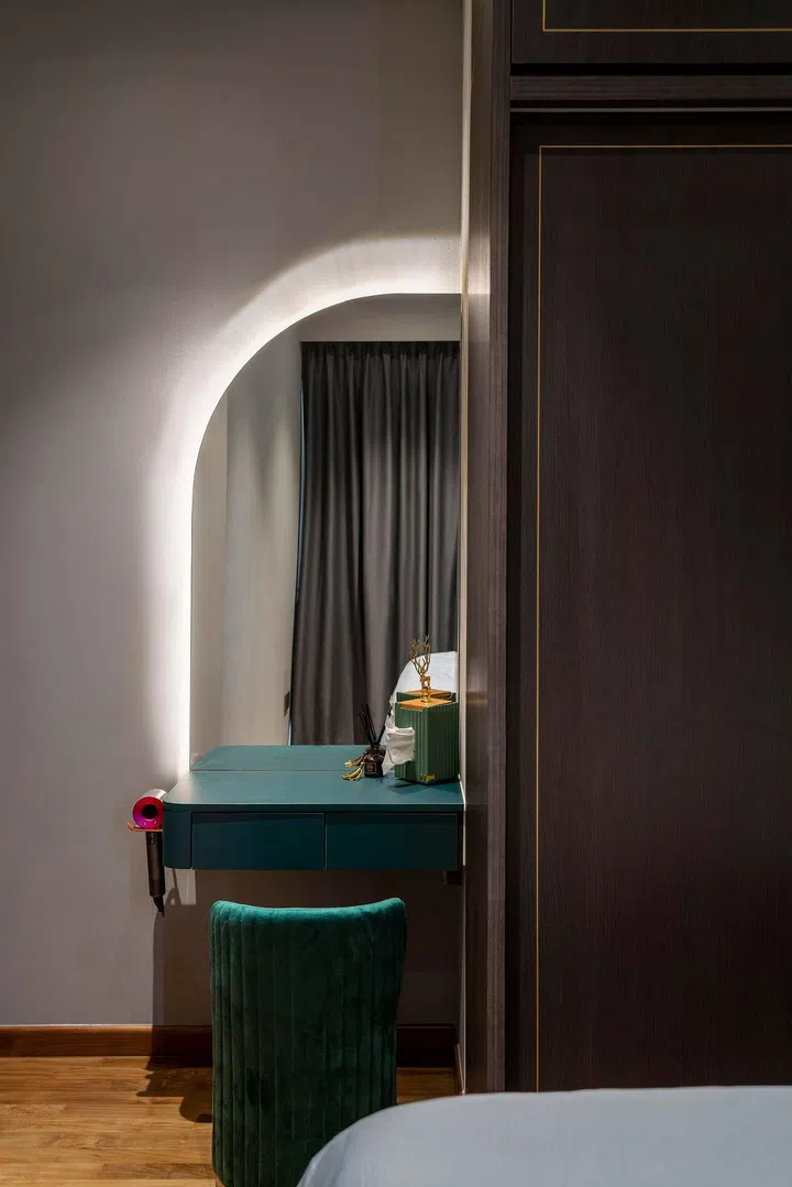 Located next to his wardrobe, the small but well-planned table appears like an extension of the cabinetry, with a curved mirror to finish the look.