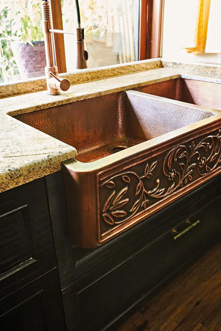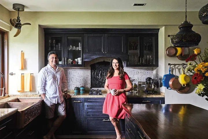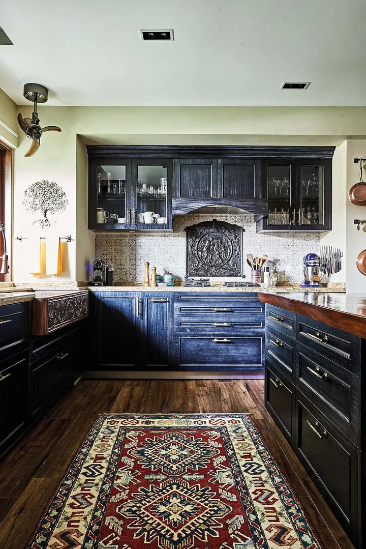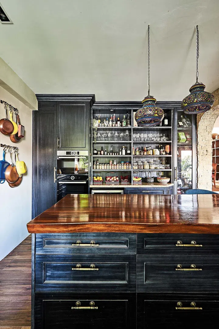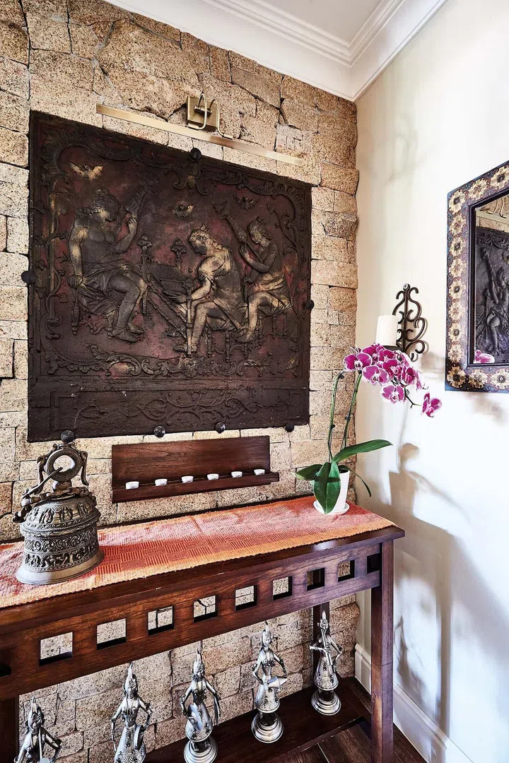 From a 250-year-old cast-iron fireback imported from Paris to a carved 106cm copper sink custom made in India, unique details infuse the space, also the couple’s favourite spot for chilling out and hosting guests, with vintage flair. While a lot of the decor pieces came from the couple’s respective homes before they tied the knot, they meld together beautifully here. Many were also sourced from antique stores as well as shipped from India.