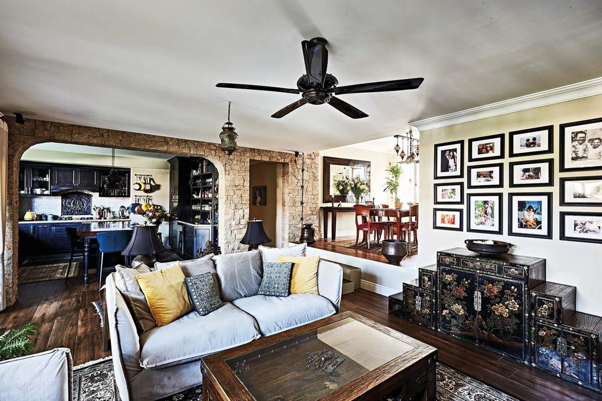 The design of the rest of the home was overseen by Richard Pang of Square Room Interior Design. The living room boasts wood look floor tiles and other furnishings with Asian influences, including a wooden cabinet painted with flowers and a coffee table repurposed from an old wooden door.