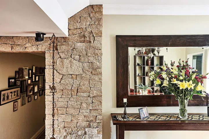 Its architectural star is undoubtedly the stone arch framing the kitchen entrance and extending towards the balcony. Unable to find the right stones to create the rustic look the owners wanted, they found a large boulder at Hot Spring Stone and had it cut into smaller pieces.