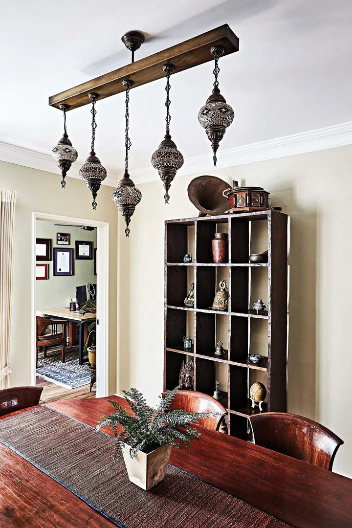 Across from the kitchen, brass pots and chains from India rest on a raised platform and stained glass pendant lamps from a shop on Arab Street add charm to the dining area.