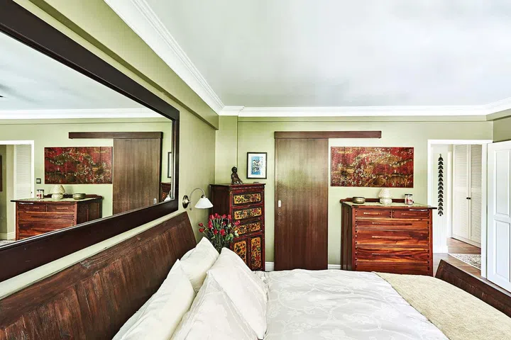 Down the hallway, the master bedroom has a walk-in closet – also designed by Calsia – that used to be a part of what’s now the kitchen. There are also various furnishings the couple has collected over the years as well as an imported painted wooden cabinet from Tibet, an ottoman from India, a Chinese scenic painting and a custom vanity corner for Lisa.