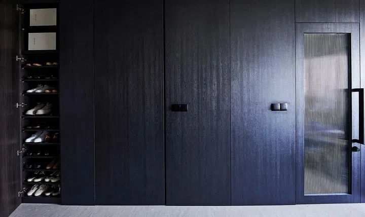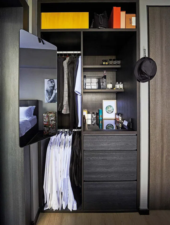 The bedroom features a more woodsy black and white material palette, and a custom open wardrobe finished with the same laminate. The condominium developer initially provided the existing space for a vanity, but Christopher chose to use it for the wardrobe instead.