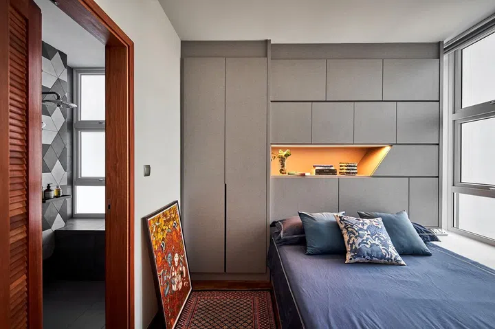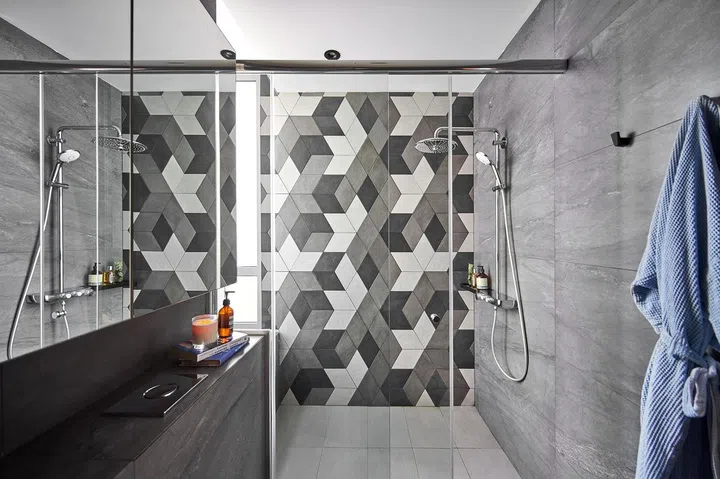 Echoing the decor of the living room, the bathroom also features a wall with geometric accents, done up in the same cool shades of gray as the bedroom. There's also plenty of storage space here, thanks to the cabinetry and built-in vanity.