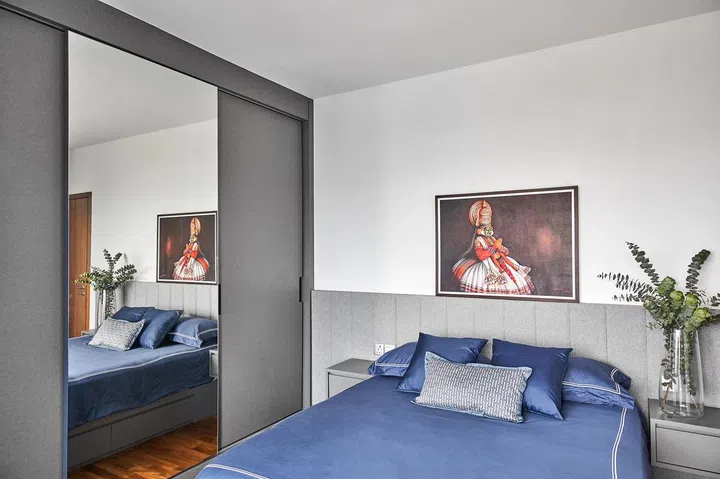 The cool gray palette continues in the master room, lending an air of serenity punctuated by the art on the walls.