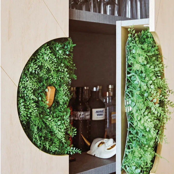 In the cupboards in the living room, for instance, the handles are actually tiny wooden birds nestling in greenery.