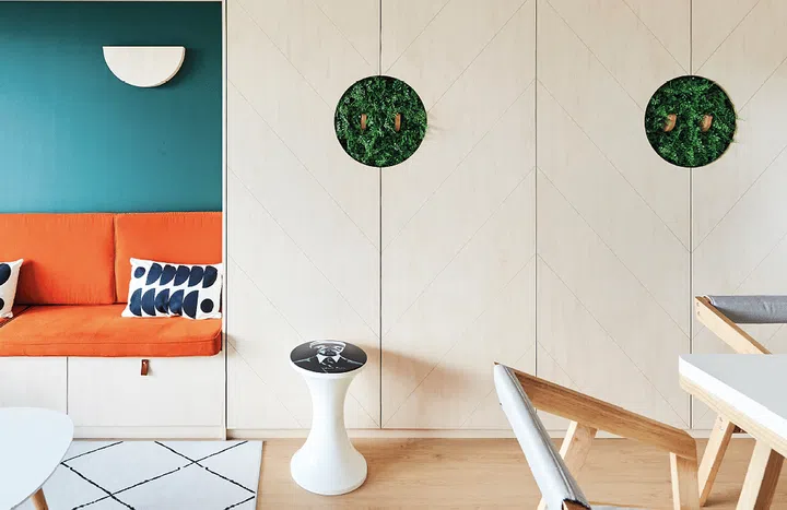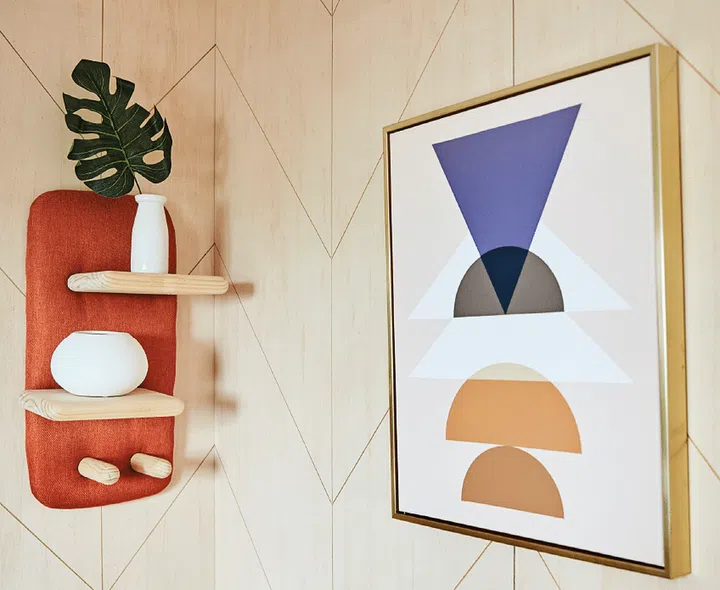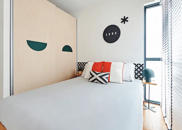 To break up the linearity and prevent the apartment from looking boxy, Carmen used plenty of geometric shapes to create interesting patterns, like the chevron lines on the full-height cupboards and wall lights in the shape of semi-circles. Carmen also added bright pops of colour and whimsical details.