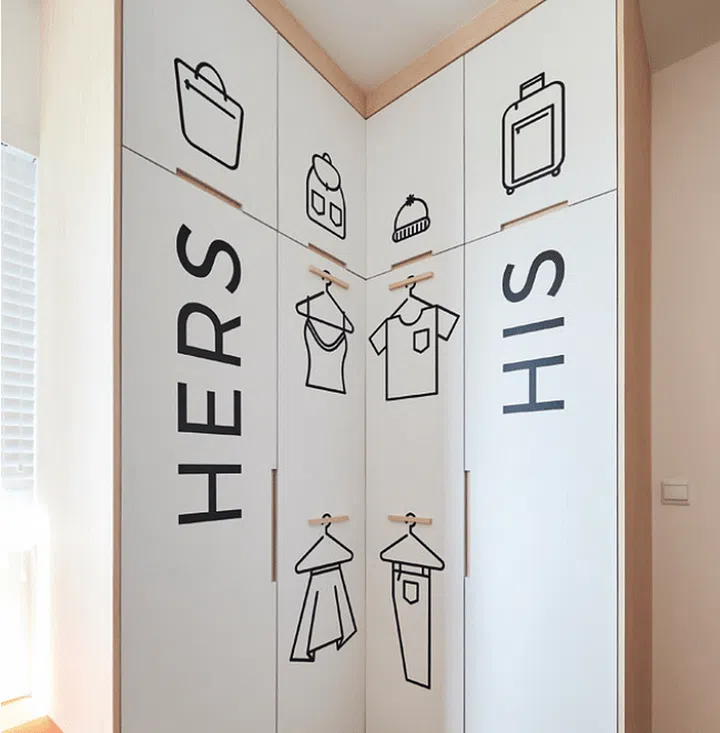 The typographic installations and geometric theme continue in the rooms. In the walk-in wardrobe is jazzed up with decals that serve not only as a delineation of the “his and hers” wardrobes, but also lend a playful touch with the icons of skirts, tops, and jeans.