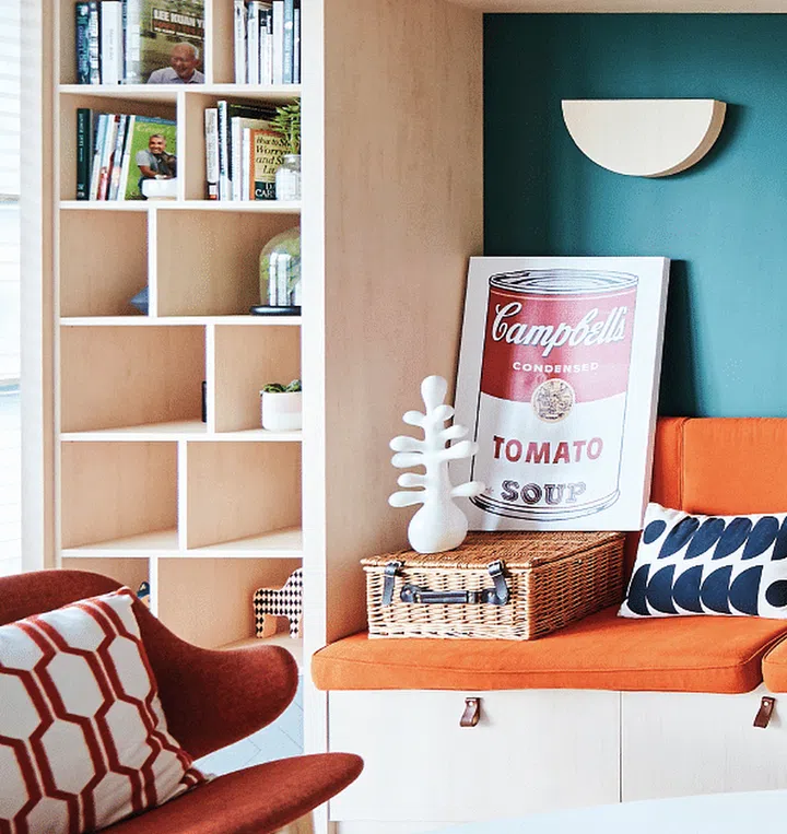 At the opposite end, sitting in pride of place is a retro-style TV console inspired by The Jetsons. Complete with antennae and tulip leg, the setup’s tongue-in-cheek TV-in-TV concept is a talking point every time guests come to the house.