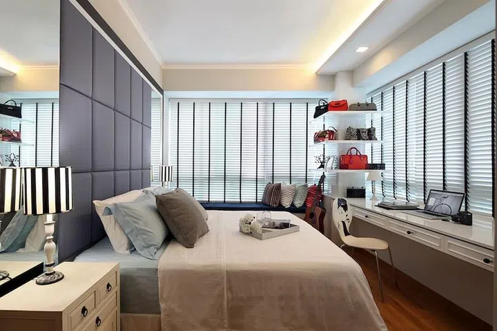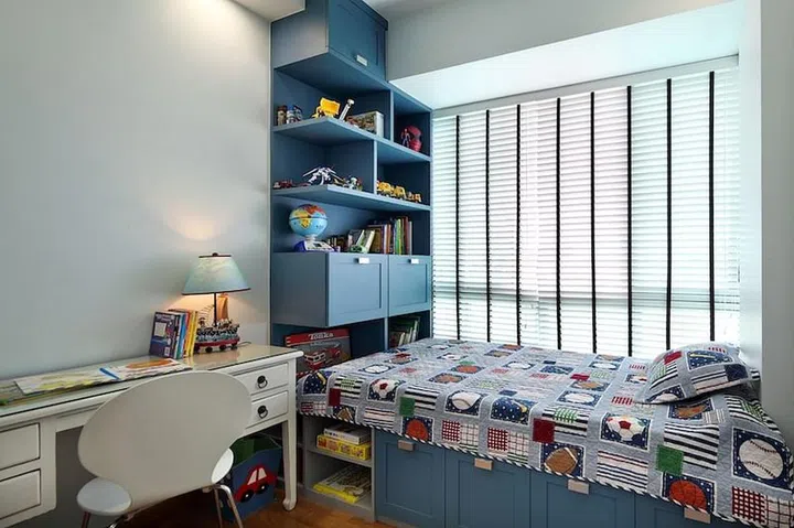 The son's room is outfitted with customised built-in structures — a bed and display shelving in an attractive shade of blue.