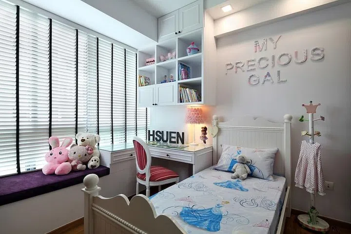 The daughter's room has a "princess" theme, with a mostly white colour palette.