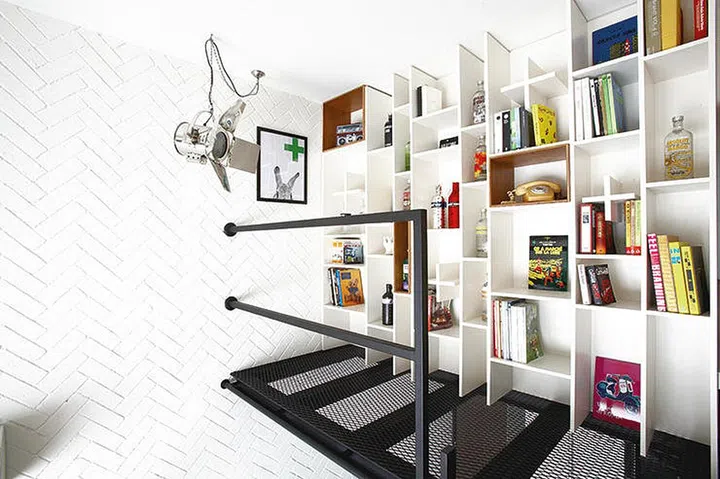 Midway up the industrial-style stairs with their clean metal lines, a thoughtfully designed platform that extends from one exposed brick wall to the staircase was constructed to give the owner her own personal library, with custom built shelves that stretch across the space, providing both storage functionality and visual interest in keeping with the industrial loft aesthetic.