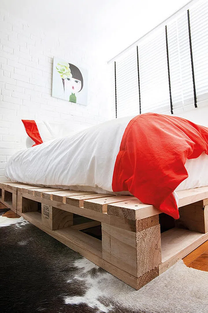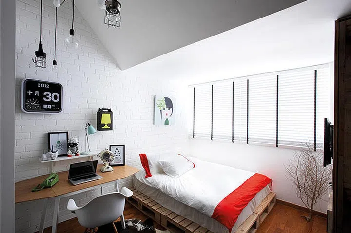 The thoughtfully designed bedroom continues the cohesive industrial theme with a similar harmonious mix of raw materials and industrial vibe as the living area - a textured plain brick wall features prominently behind the bed, adding warmth and character, while the bed itself sits atop an innovative platform ingeniously crafted from four processed pine pallets, exemplifying the upcycled approach often found in industrial design.