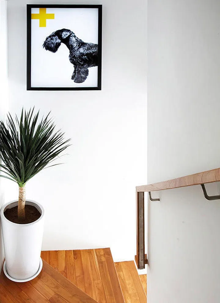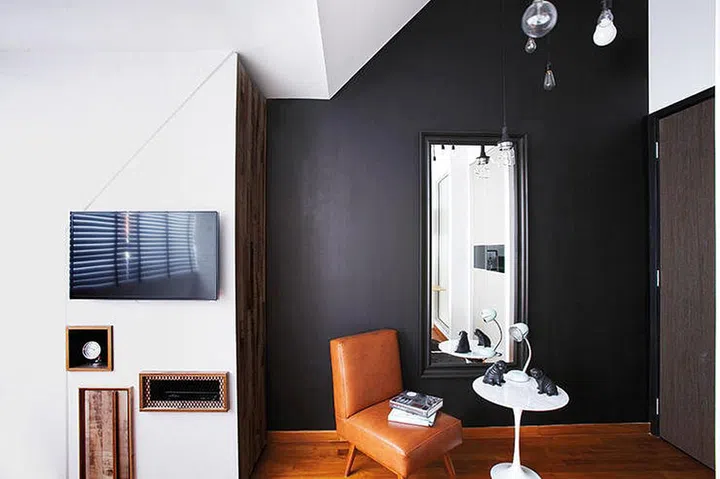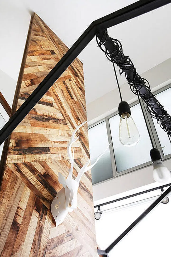 There’s no way one can miss the striking miniature “house” - cleverly suggested by a minimalist metal-frame outline of a three-dimensional abode, complete with exposed hanging bulbs dangling from the top bar, embodying the raw industrial aesthetic that runs throughout the loft while creating a focal point that draws the eye upward to appreciate the soaring ceiling height.
