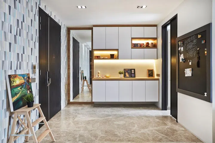 The entrance area has many practical features, such as a full-length mirror and storage unit where household knick-knacks can be held for before leaving and entering the house.