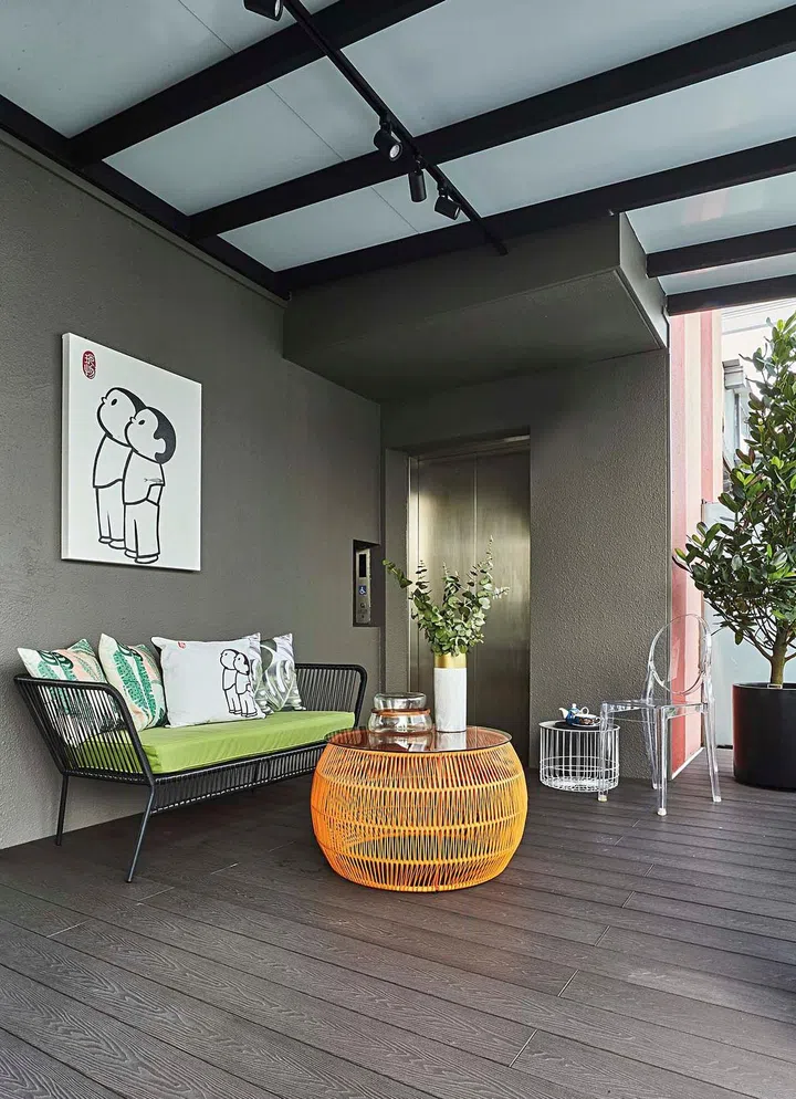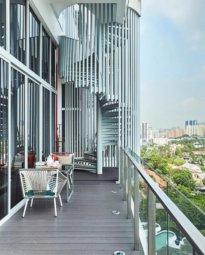 The balcony that wraps the apartment’s glass walls is finished in WPC (Wood Plastic Composite) decking, and so are the steps of the spiral staircase and the upper deck.