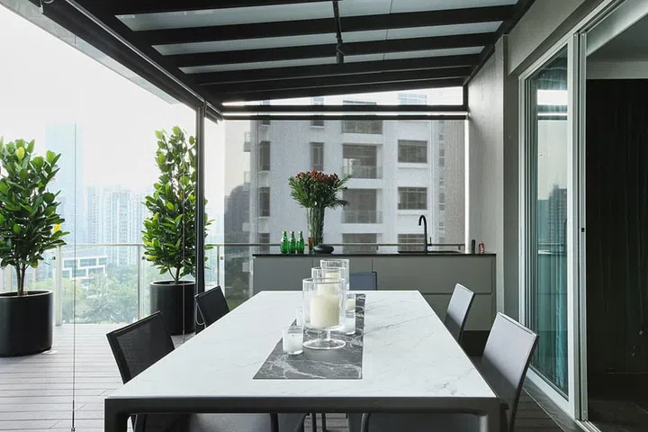 Adrian built a new structure on this deck, which houses a canopied outdoor dining area, and a cosy entertainment room encased in glass and gypsum board.