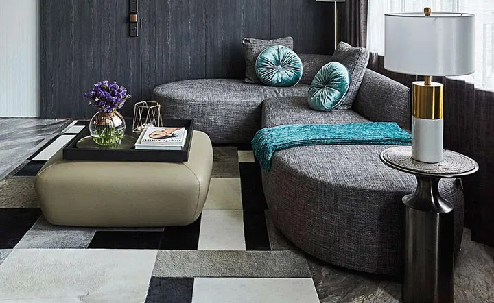The wall behind it is panelled, with slanting depths that create a play of shadows. Cowhide rugs, cushions in sparkly, silky and woven materials, and embossed geometric wallpaper create a multi-sensorial experience.