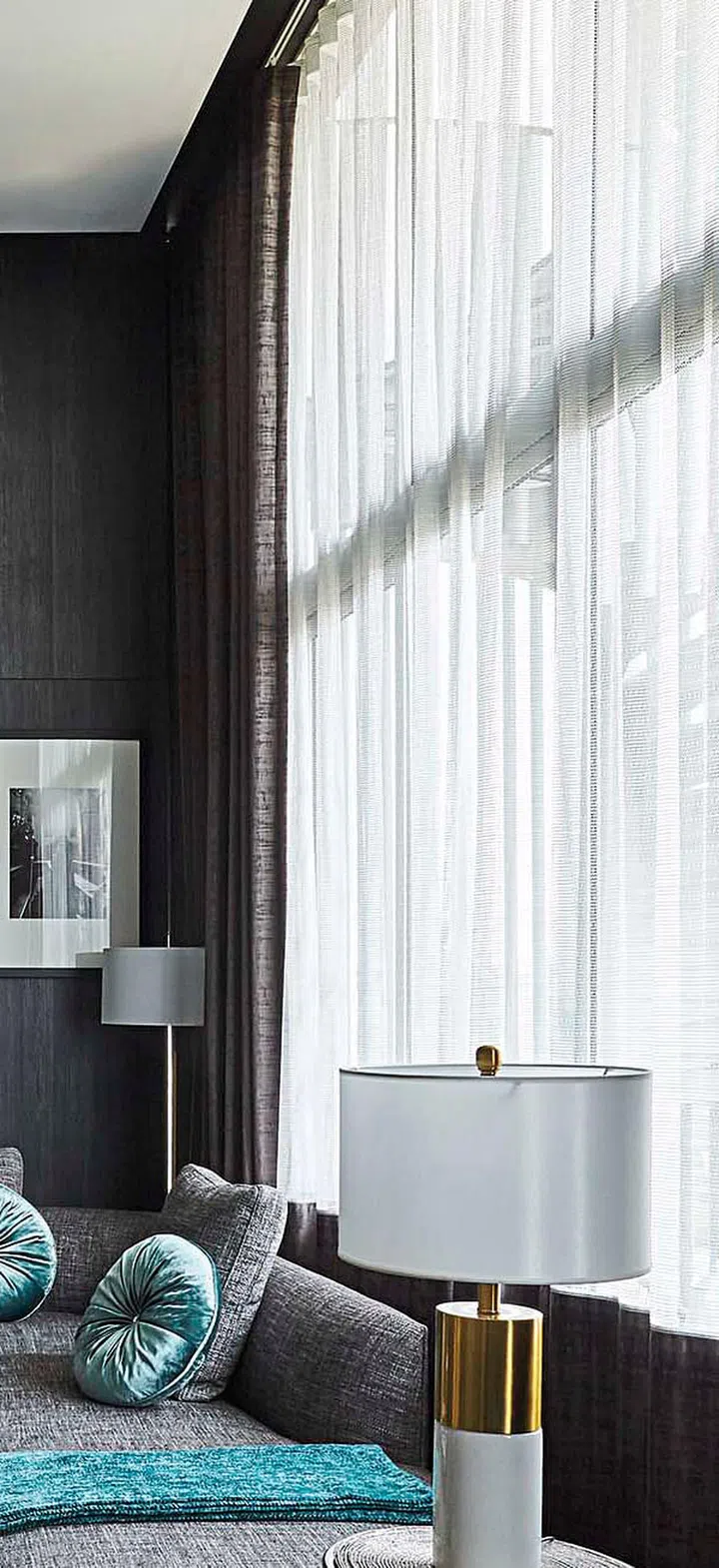 The sheer layer features a solid fabric trim on its bottom, up to the sofa’s height, so when the layer is closed, the view is framed nicely by the sheer upper part.