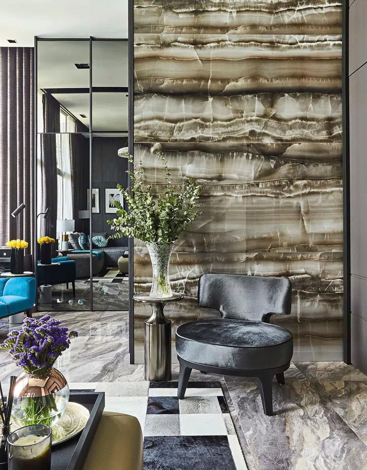 A feature wall finished in dark, large-format marble-look tiles from Hafary welcomes visitors arriving from the main entrance.