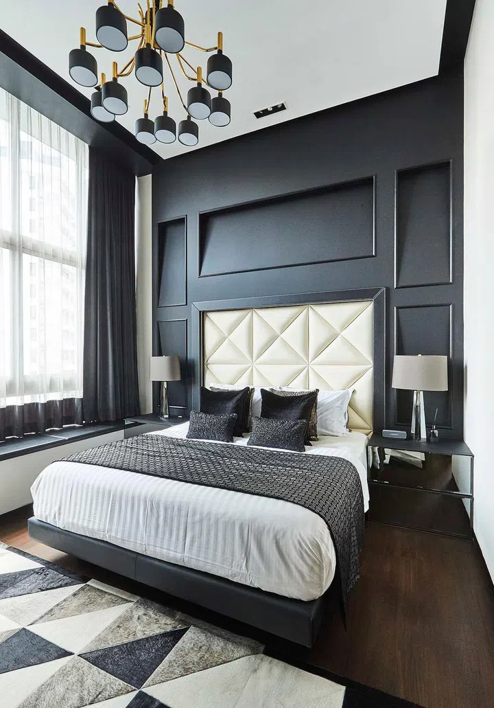 The master bedroom features a wealth of textures. Adrian fills out the tall ceiling with a black chandelier and an equally tall bed headboard finished in white leather with a geometric pattern and black leather trim.