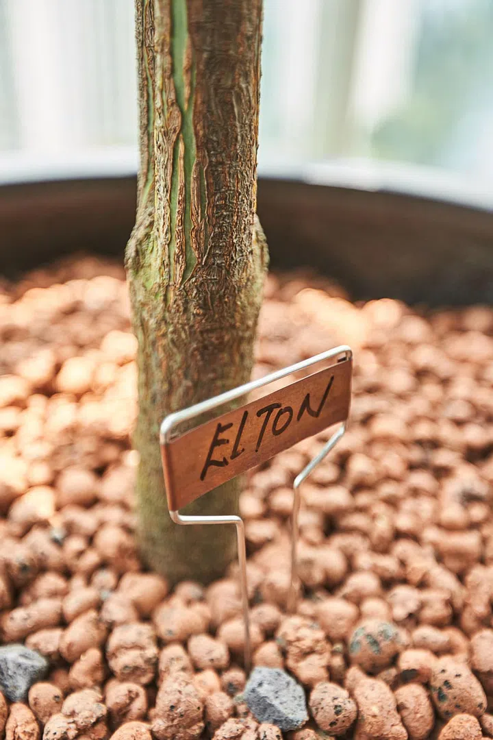 Other than the two, the apartment’s inhabitants include Elton, Cher, Madonna, Julia, George, Richard, and Long – trees housed in large planters that add a biophilic touch to the spectacular sunset view and a delightful conversation starter.
