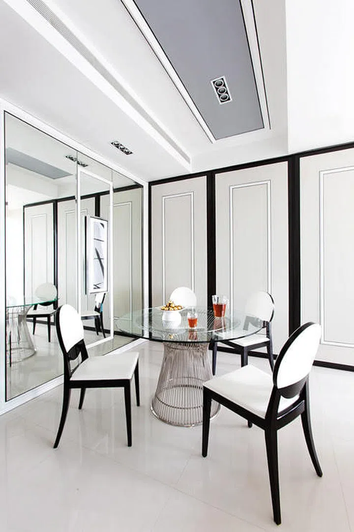 Thin black borders on the creamy wall panels and dining chairs bring out their clean simplicity. As do the moulding placed on the mirrored feature wall.