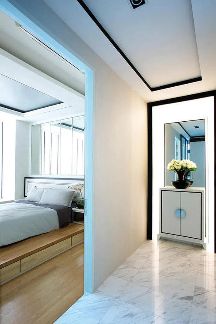 At the end of the small corridor is an alcove brightened by an LED strip that highlights the mirrored wall and table, creating an attractive focal point in the space.