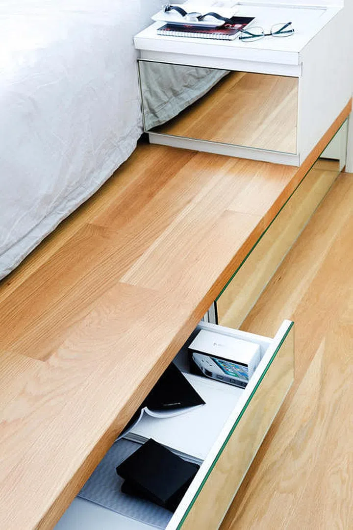 The bed platform incorporates a row of drawers for storing personal effects.