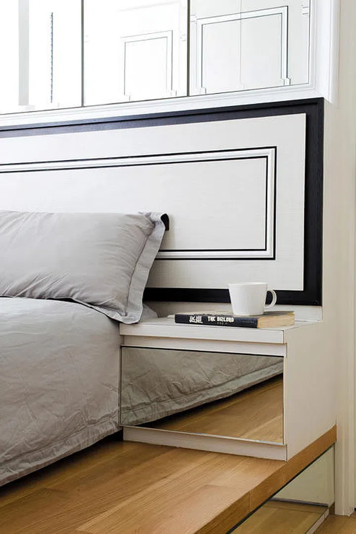 The headboard has concealed storage behind it, while mirrors above amplify the space.