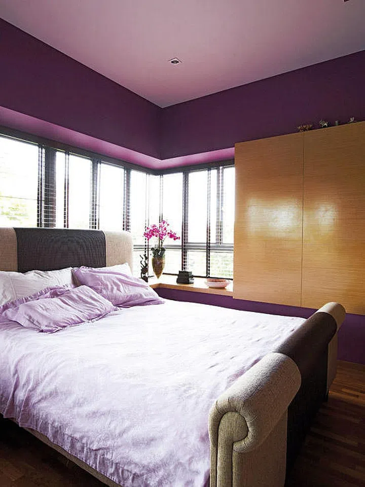 The contrasting colour play continues in the master bedroom. The use of bold colours - purple on the walls, and textured upholstery for the bedhead in contrasting materials and hues.