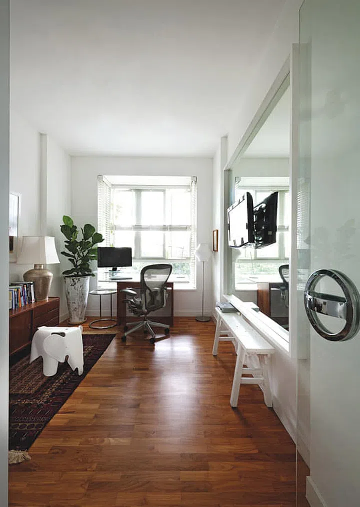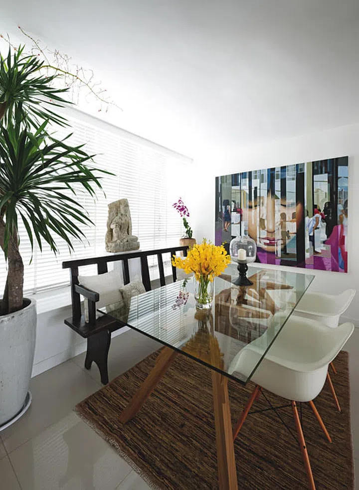 In the dining room sit a vintage, almost century-old bench from a Chinese opera house, and a set of Eames armchairs.
