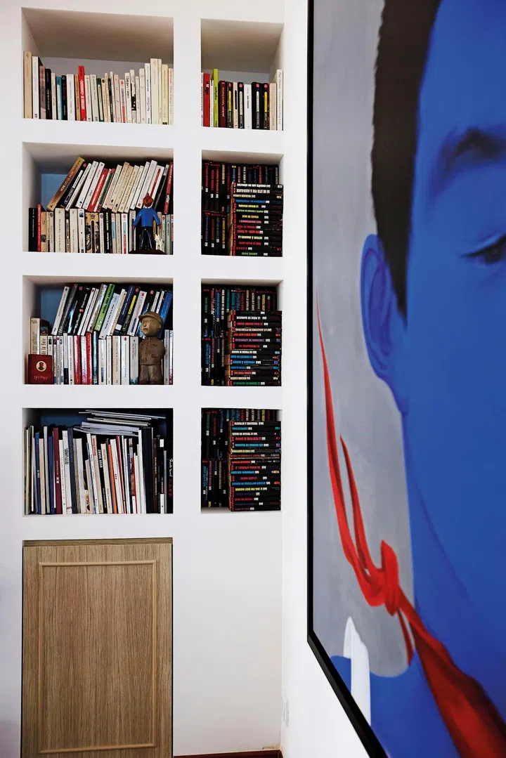 To keep the full-height custom shelving visually light, the homeowner had it done in white and pale wood, and paired with a large, imposing painting that draws the eye away.