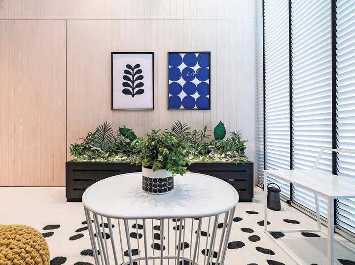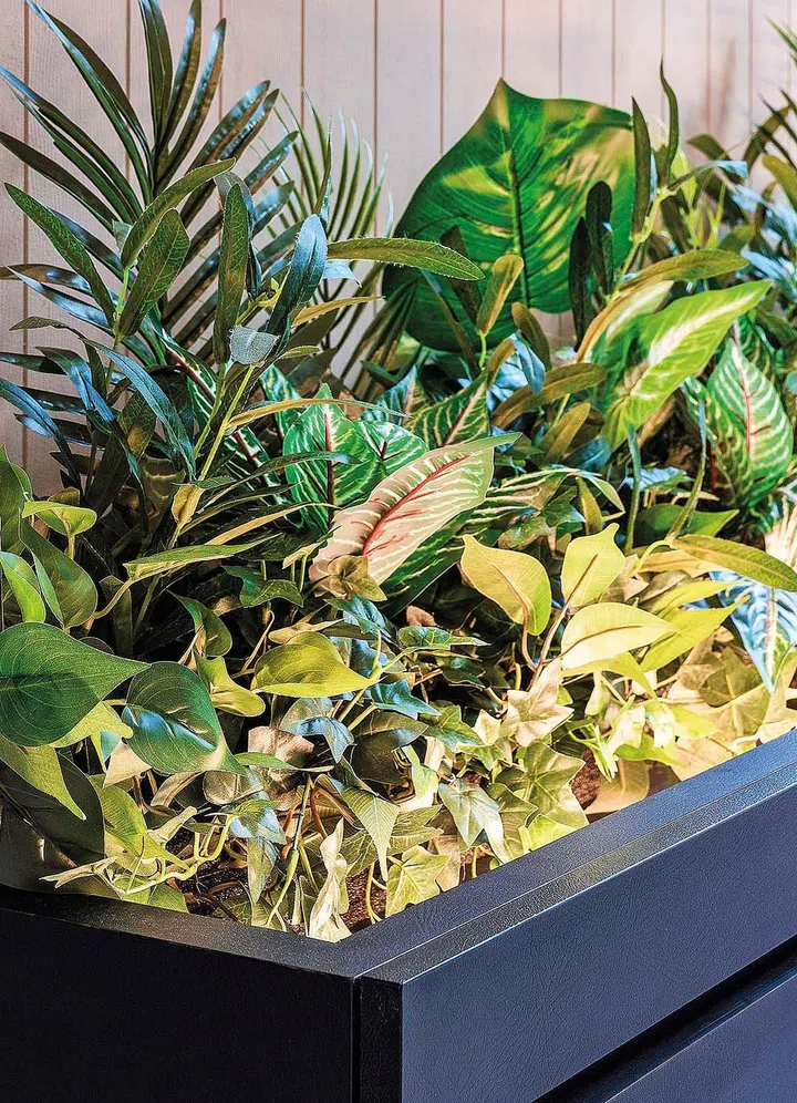 Wolf Woof's signature design strategy shows up in the custom-designed TV console in the living room that looks like a planter. Carmen is very proud of this design.