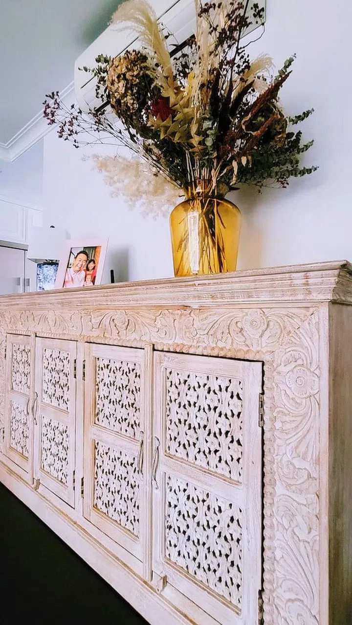 An light, neutral, intricately-carved cabinet like this one helps to balance out the heavier elements while still lending visual interest.