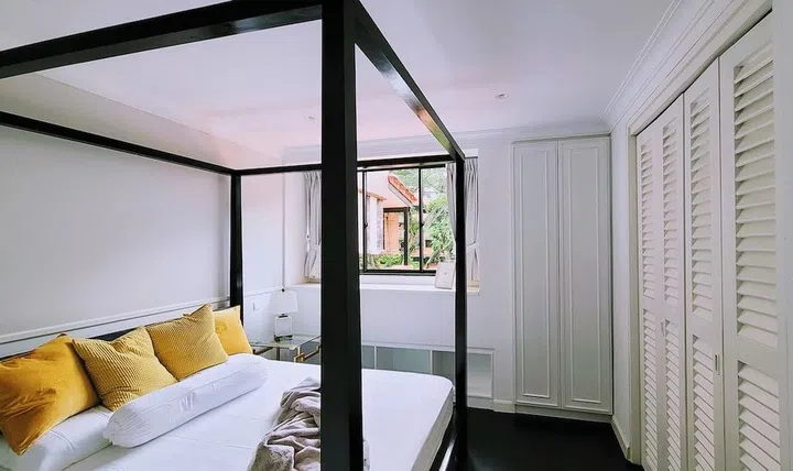 Which colonial mansion would be complete without a four-poster bed? In the master bedroom, the four-poster creates a focal point in the otherwise all-white bedroom. A white louvre door separates the sleeping quarters from the walk-in closet.