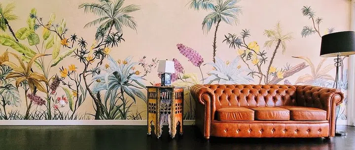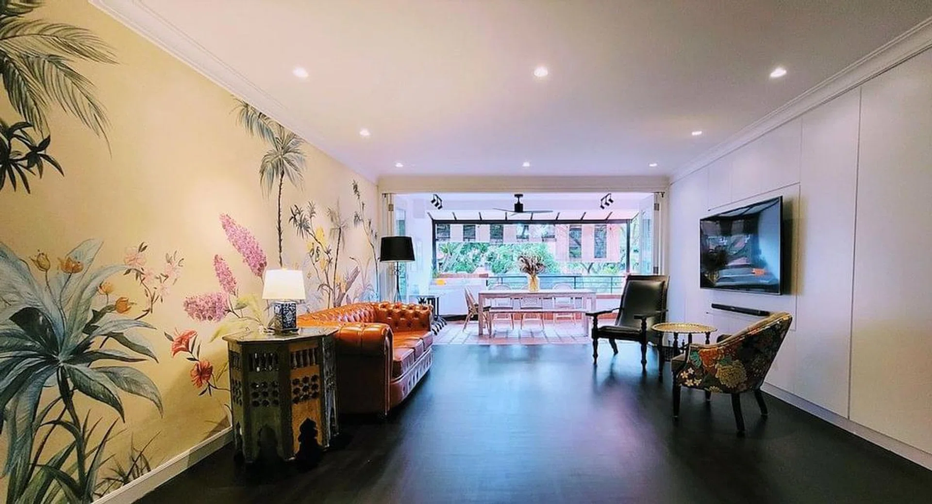 In pride of place in the living room is the seven-metre wallpaper, outfitted with bright floral wallpaper that breathes life into the living room and reflects the greenery outside.