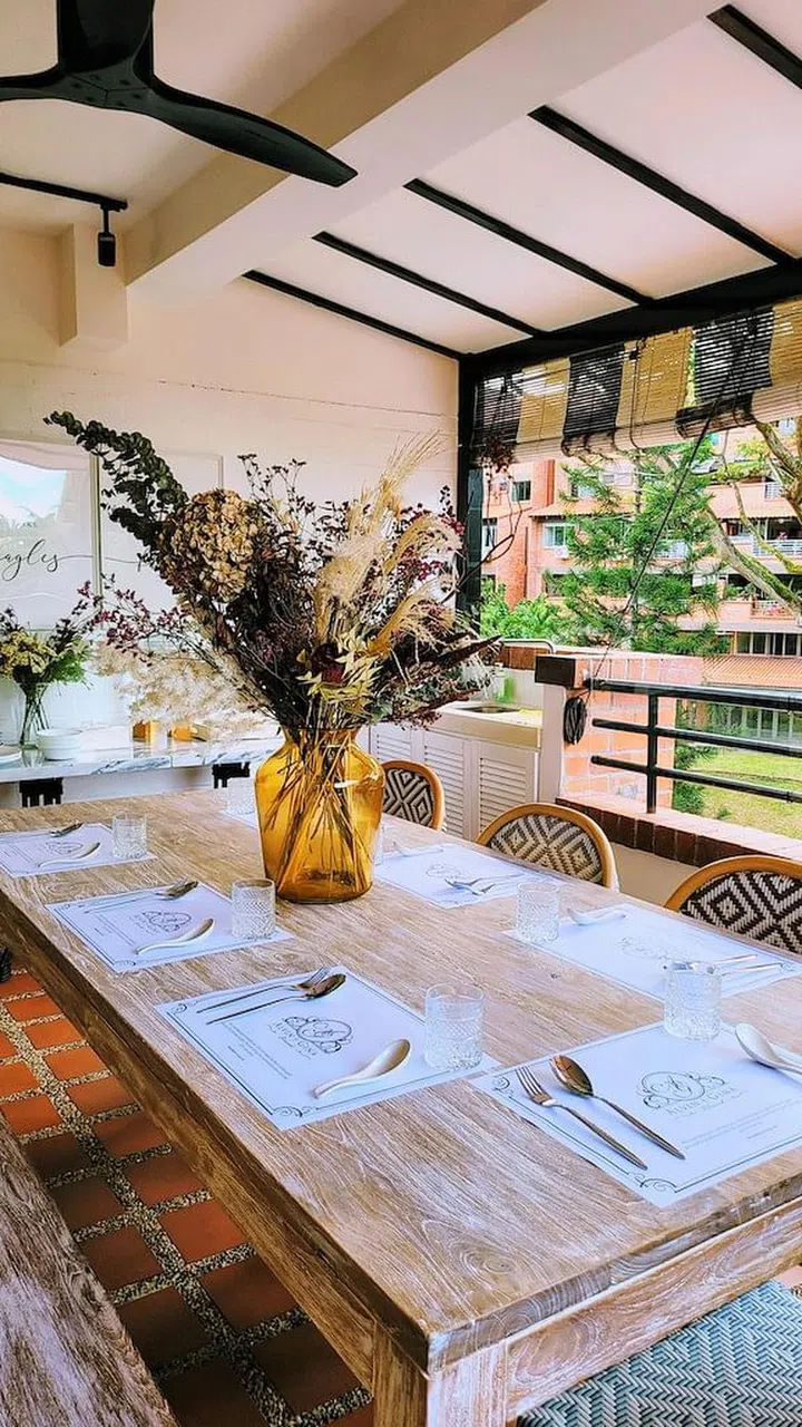 The dining area is set in the 150sq ft balcony, which overlooks a lush green field. Ceiling beams, traditional rattan awnings, and a scrubbed wooden table complete the look.