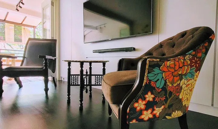 Alvin and Gina chose a dark wood floor – reminiscent of Raffles Hotel – to connect all the spaces together. They wanted a large, spacious area that would be able to host gatherings, so they reoriented the location of the TV and sofa to create more space. The TV console itself is also kept minimal – they did away with the usual boxy setup and large speakers, choosing instead to have a smart Wi-Fi connected TV that can mirror their phone display for streaming services.