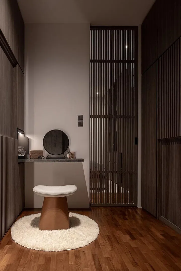 To make the living area feel more intimate, the team built a partition wall with fluted panels on all sides and rounded corners to separate the entrance foyer from the living room.