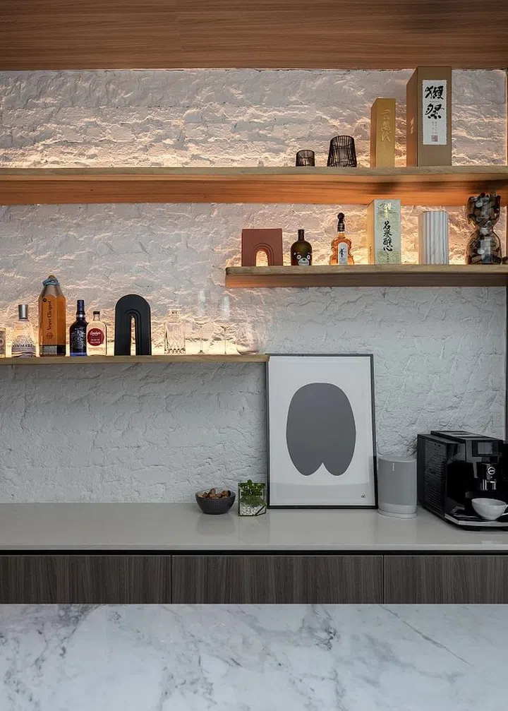 The interior design team decided to make use of the exposed brick wall behind the counter and turned it into the highlight of the space with a matte white finish and the addition of some floating backlit display shelves.