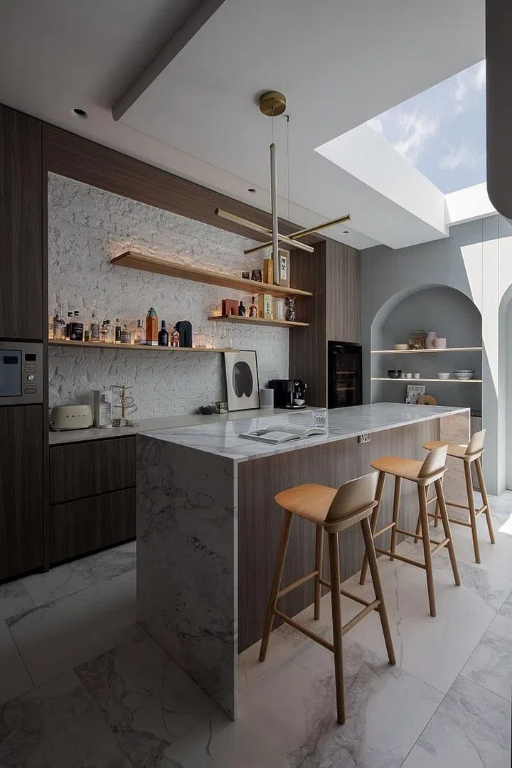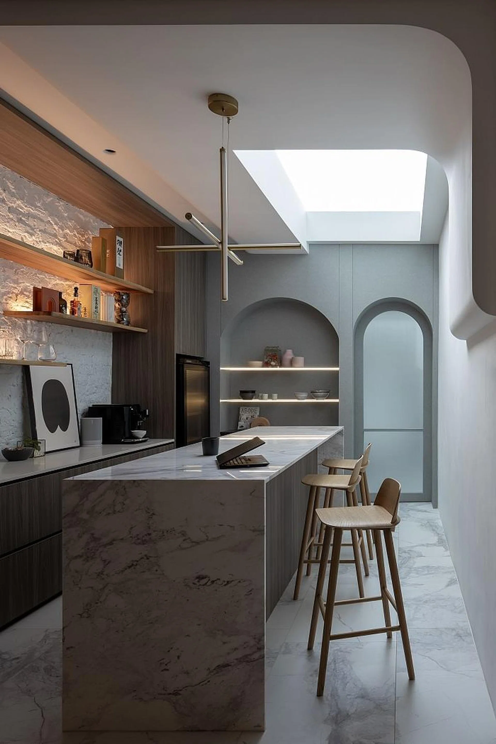 A marble kitchen island takes centerstage in this area, backed by a beautifully-designed backwall and counter.
