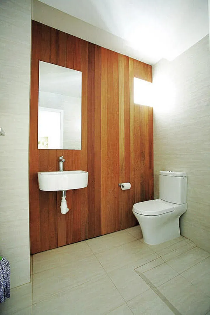 Bawa timber, typically used for outdoor decking, clads one wall of the powder room for a warm, homely look.