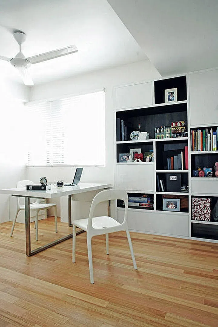 Built-in shelves house a mix of books and the husband's toy collection in the study.